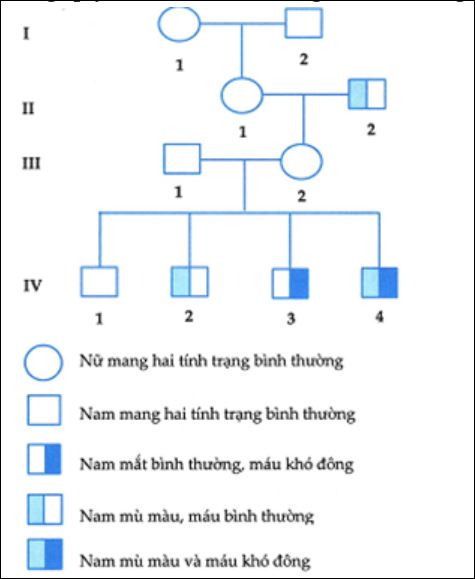 Cho biết: ở người, gen a gây bệnh mù màu, gen b gây bệnh máu khó đông đều nằm trên vùng không tương đồng của NST giới tính X, các gen trội tương ứng quy định các tính trạng bình thường. Nghiên cứu sự di truyền của hai bệnh này trong một gia đình thu được kết quả như sau